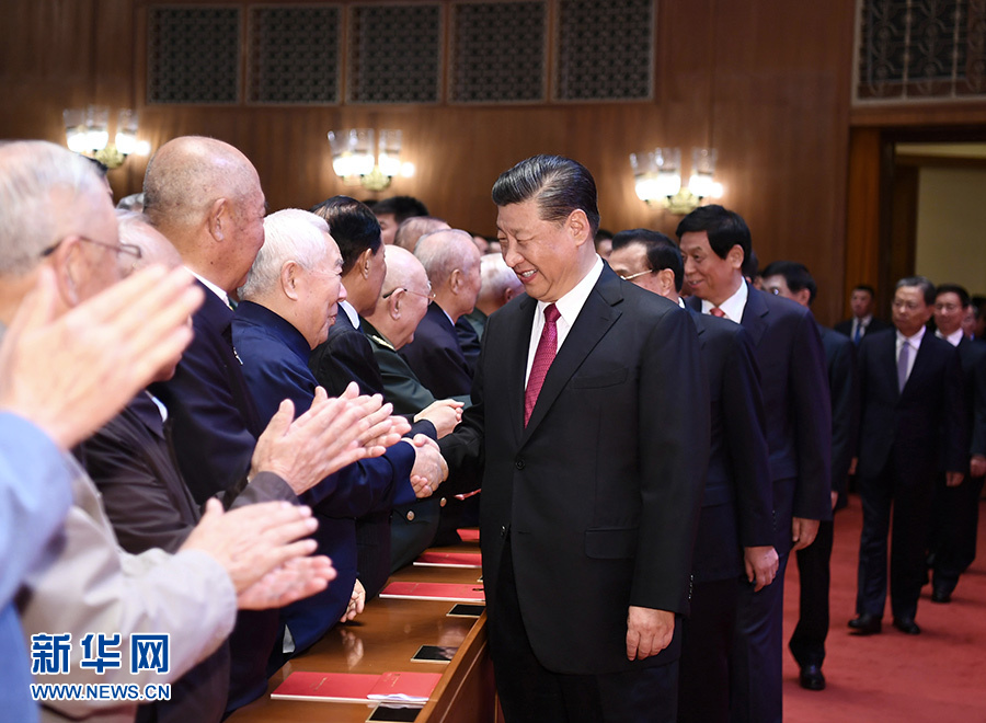 19時55分,在歡快的樂曲聲中,習近平等領導同志步入大禮堂,同老同志代表親切握手,向他們致以崇高敬意,全場響起熱烈掌聲。